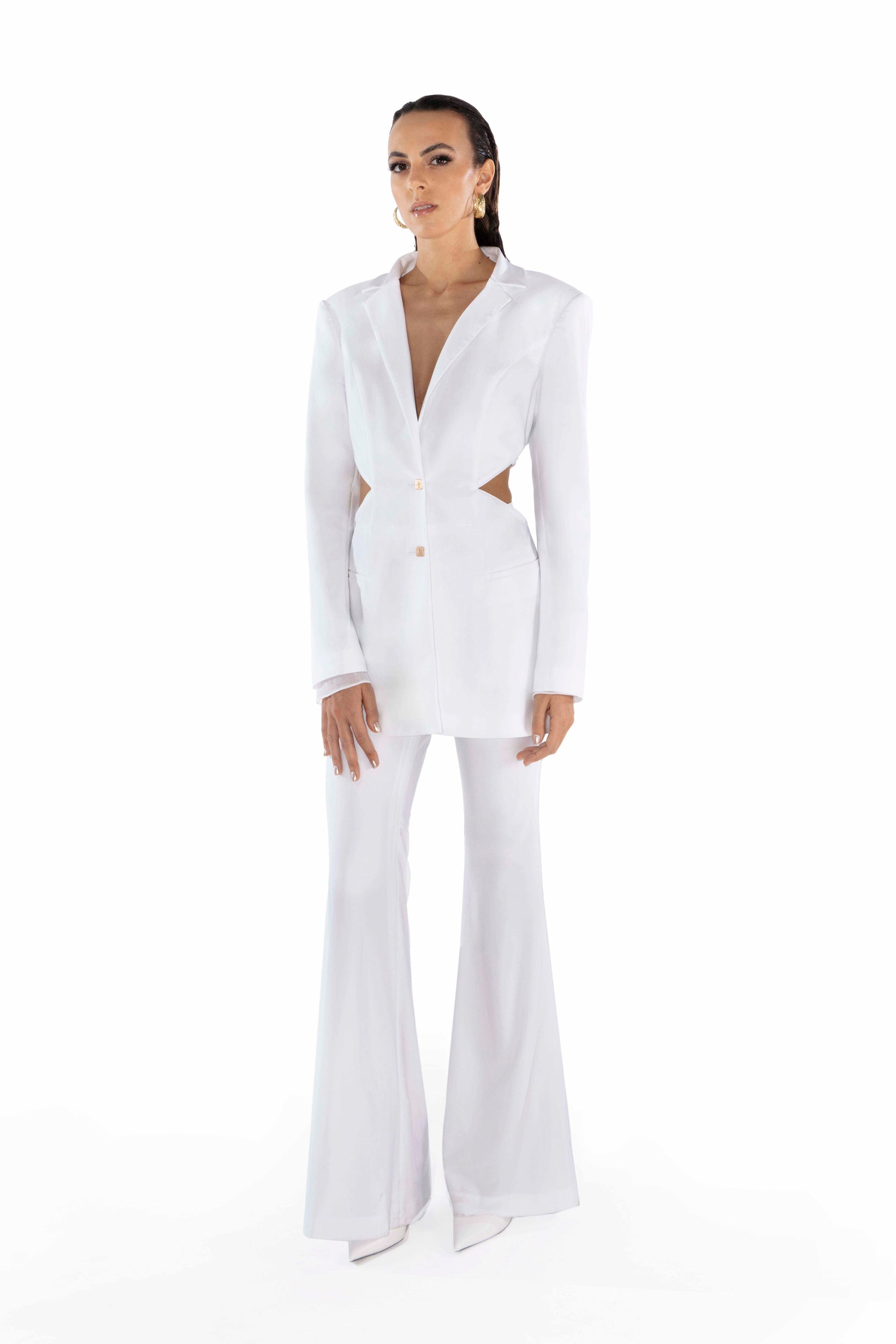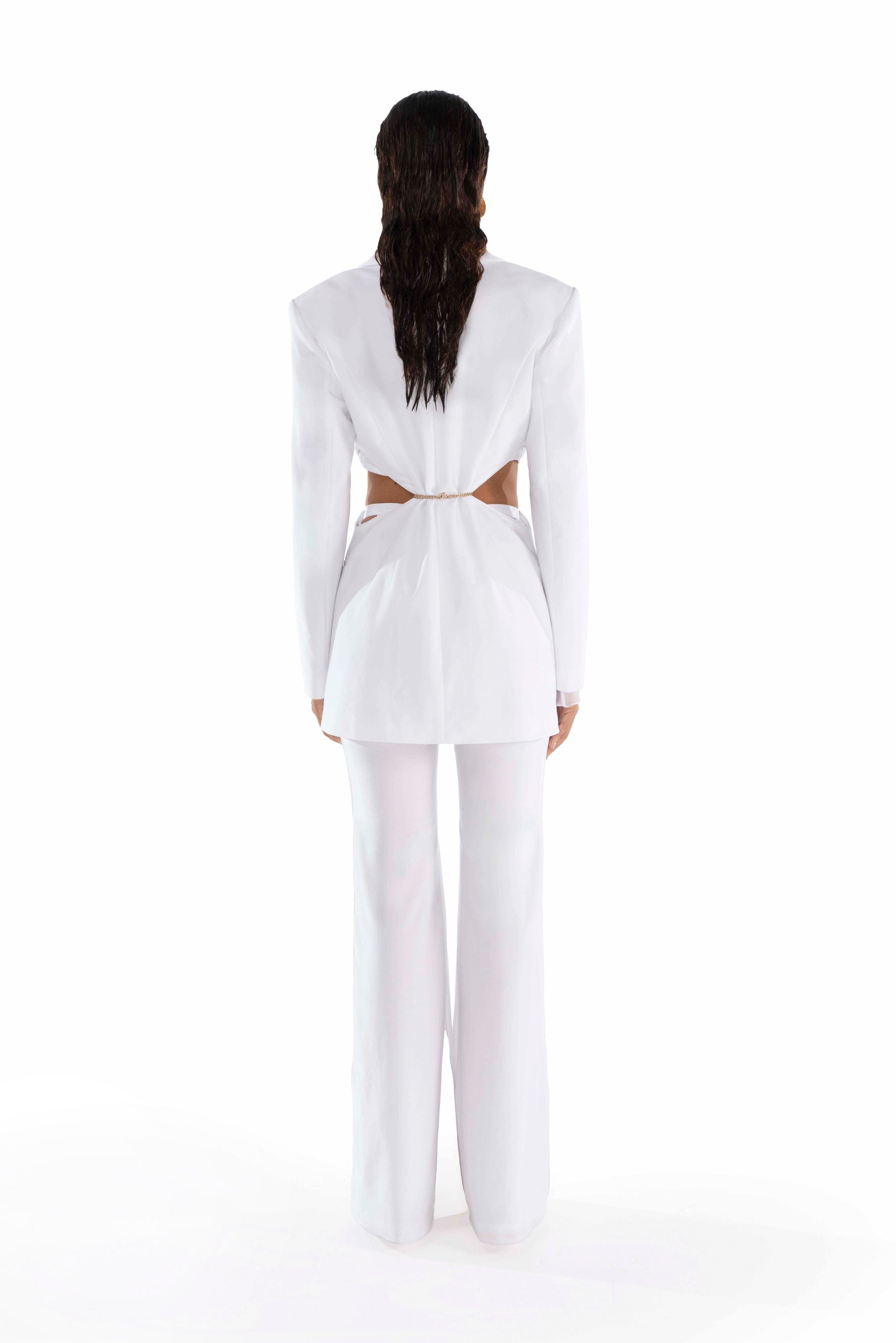 Bold, architectural, and undeniably sensual — this tailored jacket is cut from silky recycled jersey, drawing inspiration from the timeless elegance of ancient Roman columns. The design features rectangular cut-outs at the waist, adding a sculptural edge and offering subtle glimpses of skin. Designed to be worn with matching mosaic trousers or alone as a confident mini dress, the piece plays with duality: structure and fluidity, tradition and innovation. A thin gold chain bracelet with an infinity carabiner gathers the fabric at the back, creating a striking draped silhouette. The slightly oversized volume contrasts beautifully with the sharp piping details, while the single-breasted front closes with two TT logo-engraved gold buttons. Lined in soft mesh for comfort and shape.